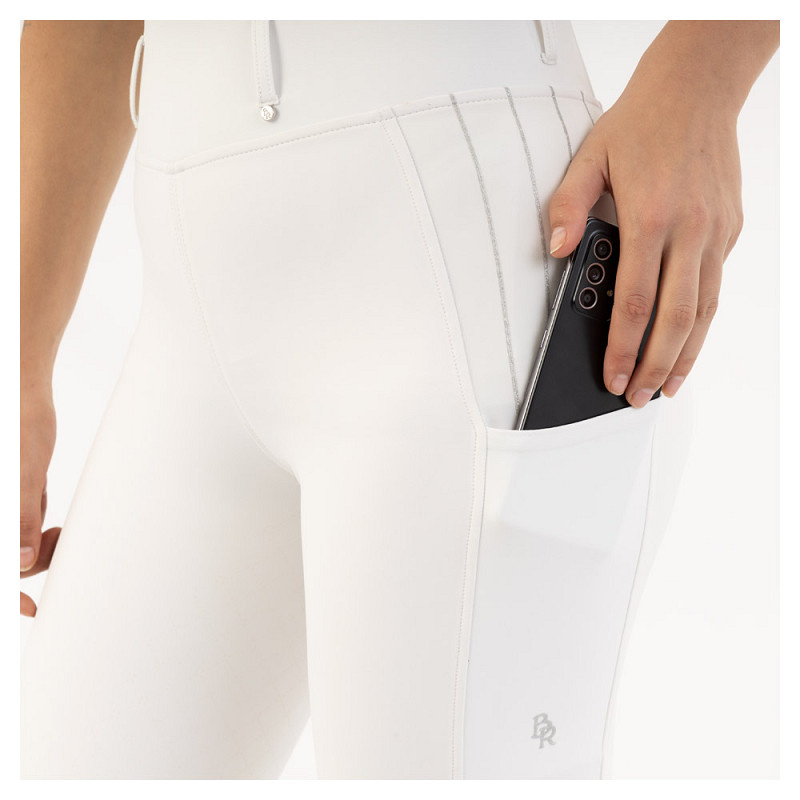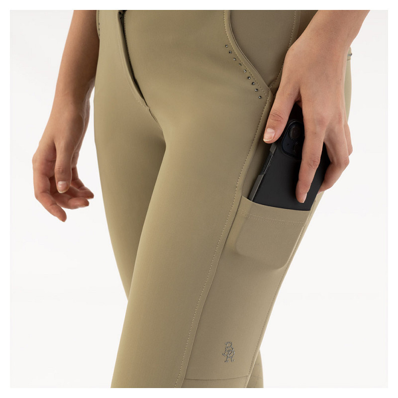 De MoLila pull-on rijbroek heeft twee telefoonzakjes, elk versierd met een prachtig champagnekleurig kristallen bandje aan de bovenkant. Op één zakje staat het woord Montar, gevolgd door een logo…